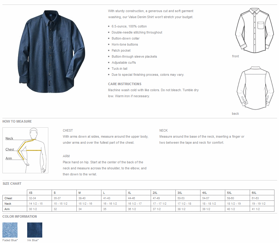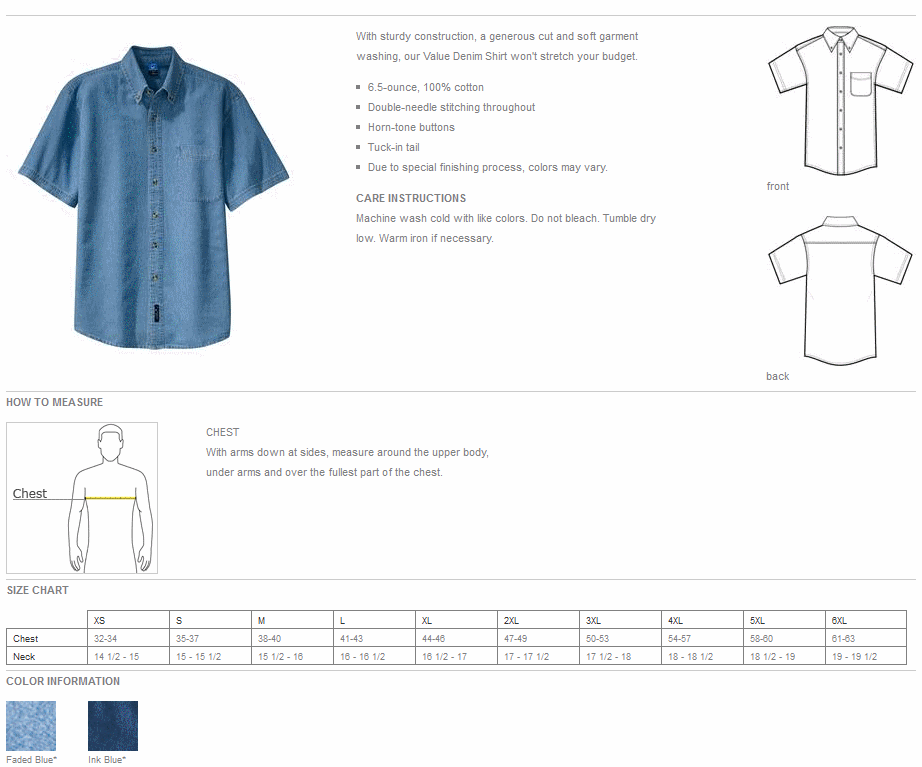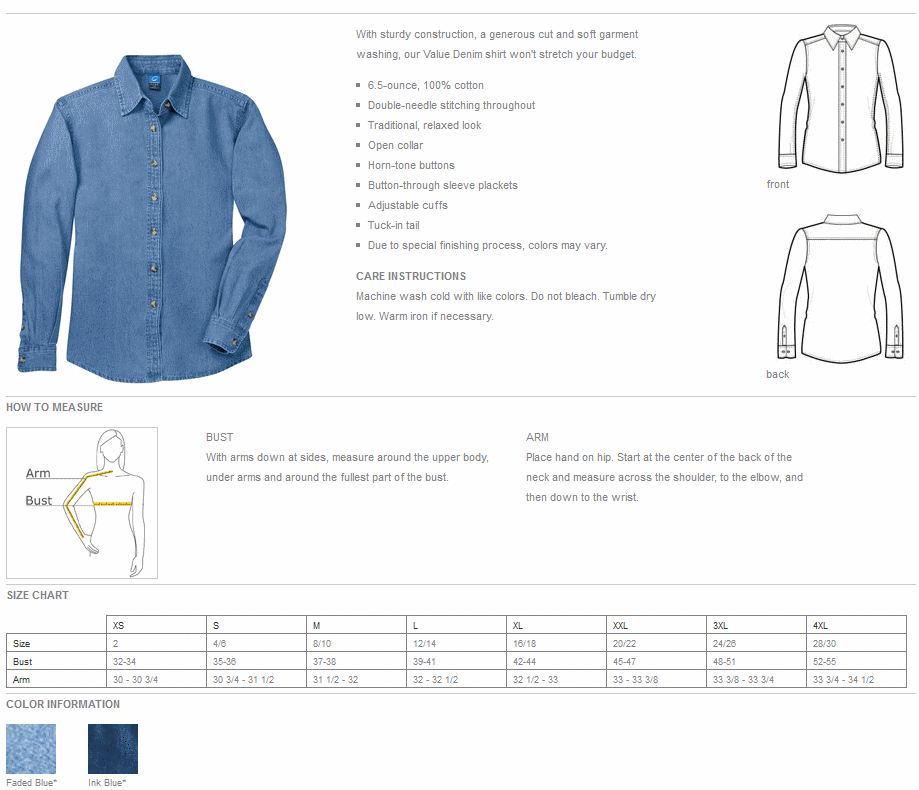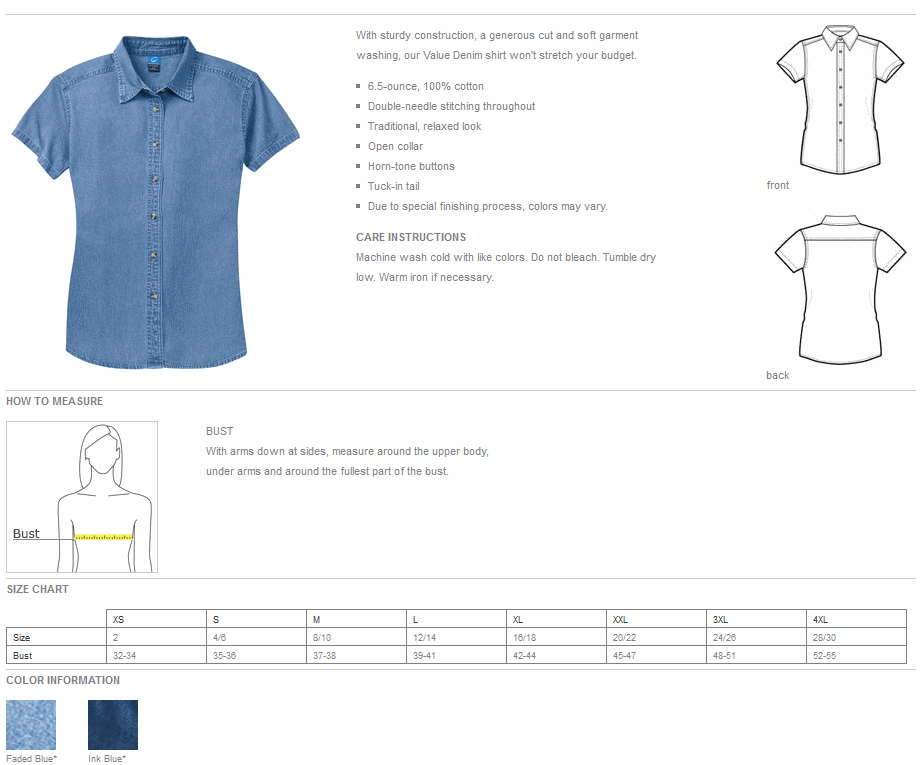 Polo shirts are available in Youth, Ladies, and Unisex. Denim shirts are available in Ladies & Mens short sleeve and long sleeve.